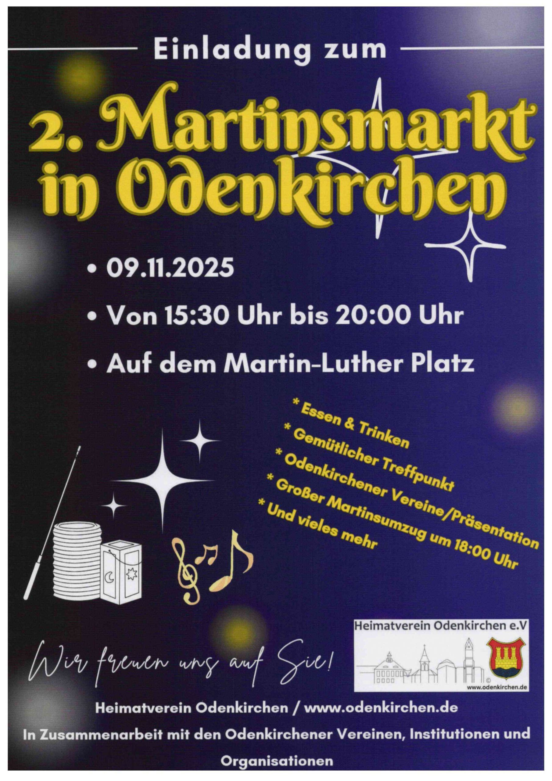 Auch in diesem Jahr lädt Odenkirchen wieder herzlich zum traditionellen Martinsmarkt ein, der – wie in den vergangenen Jahren – in Kombination mit dem Martinszug stattfinden wird. Am Sonntag, 09.11.2025 verwandelt sich der Marktplatz von 15.30 bis 20.00 Uhr in ein stimmungsvolles Zentrum des Miteinanders.